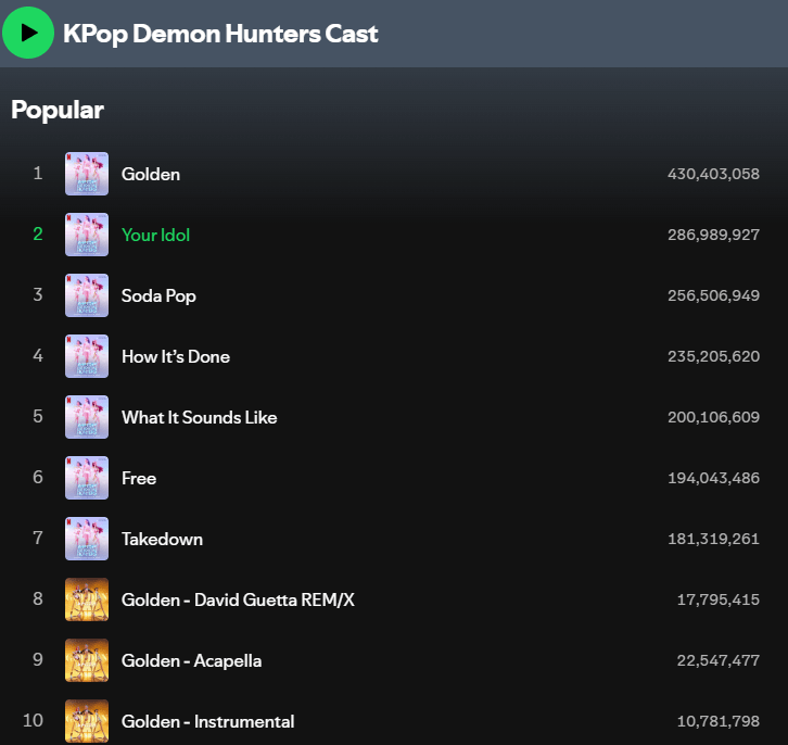 Basing on the listener counts, K-Pop Demon Hunters top song is Golden, which is what my favorite song is in the movie. Though, I would have my list like this: